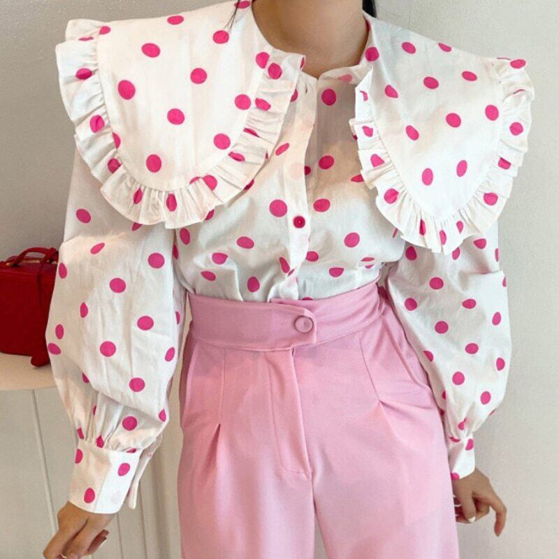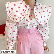 Nomikuma水玉ブラウスシャツ甘いフリルピーターパン襟女性トップス因果長袖 2022 春 ロング 大人ガーリー スウィート キュート カジュアル スプリング 春物 kor34760934046