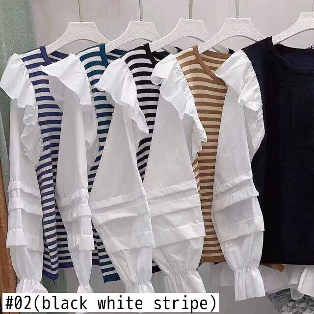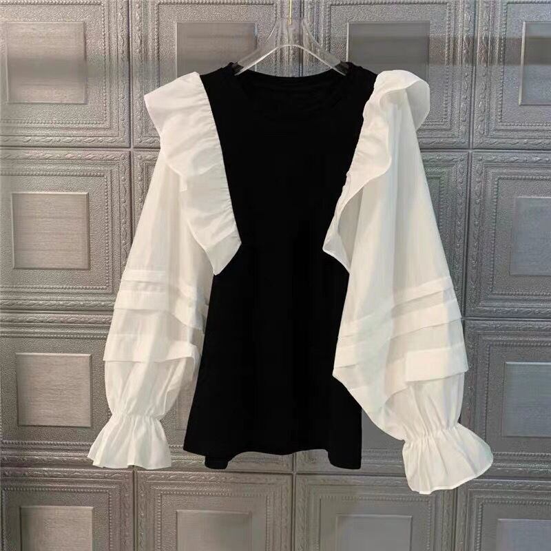 Nomikuma ヒットカラーパッチワークブラウス女性シックなフリルパフスリーブシャツ因果 O ネックプルオーバー 2022 春トップ スプリング 春物 Oネック kor40079271971