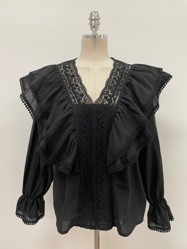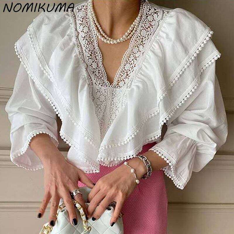 Nomikuma V ネックパッチワークレースシャツ女性秋フリルシックなトップス因果 2022 長袖プルオーバーブラウス ロング オータム 秋物 Vネック kor48860124458