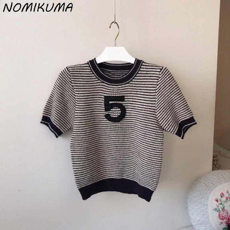 Nomikuma ヒットカラーストライプ半袖セーター女性 2022 春夏ニット因果 O ネックプルオーバーニットトップ ショート ハーフスリーブ スプリング 春物 サマー 夏物 Oネック kor54701219079