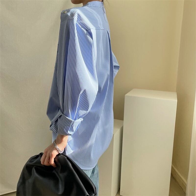ノミクマストライププルオーバーブラウス因果ボタン長袖 O ネック女性シャツ 2021 春 Feminimos 6F196 ロング スプリング 春物 Oネック kor29429064930