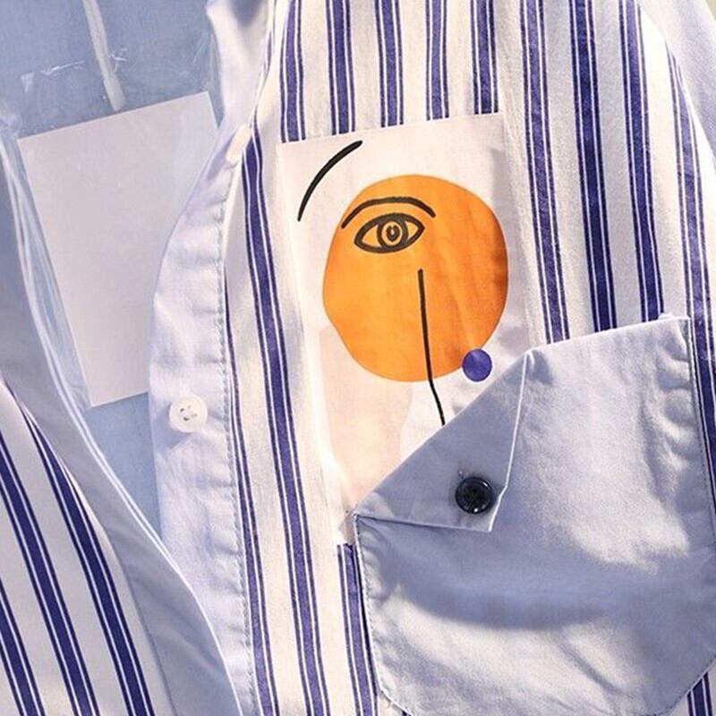 ノミクマミディアムロングブルーストライプブラウス女性 2021 春ポケットシャツ因果長袖ターンダウン襟トップ 6G466 スプリング 春物 kor22737750194