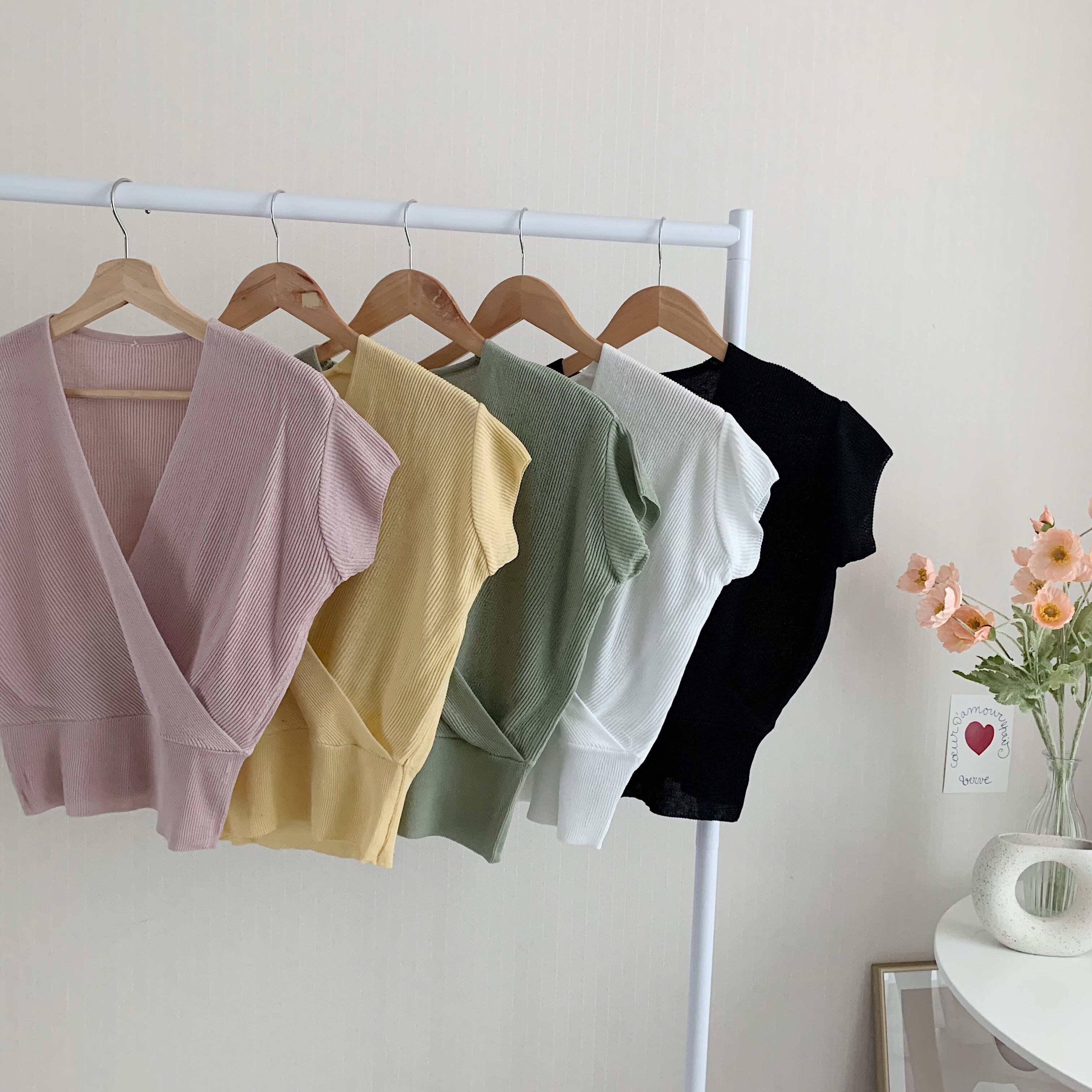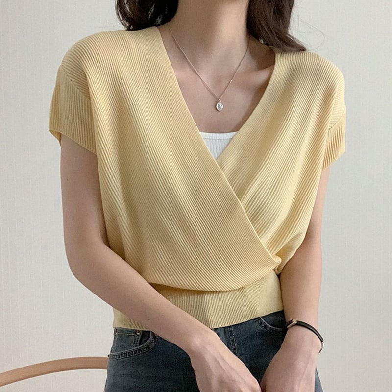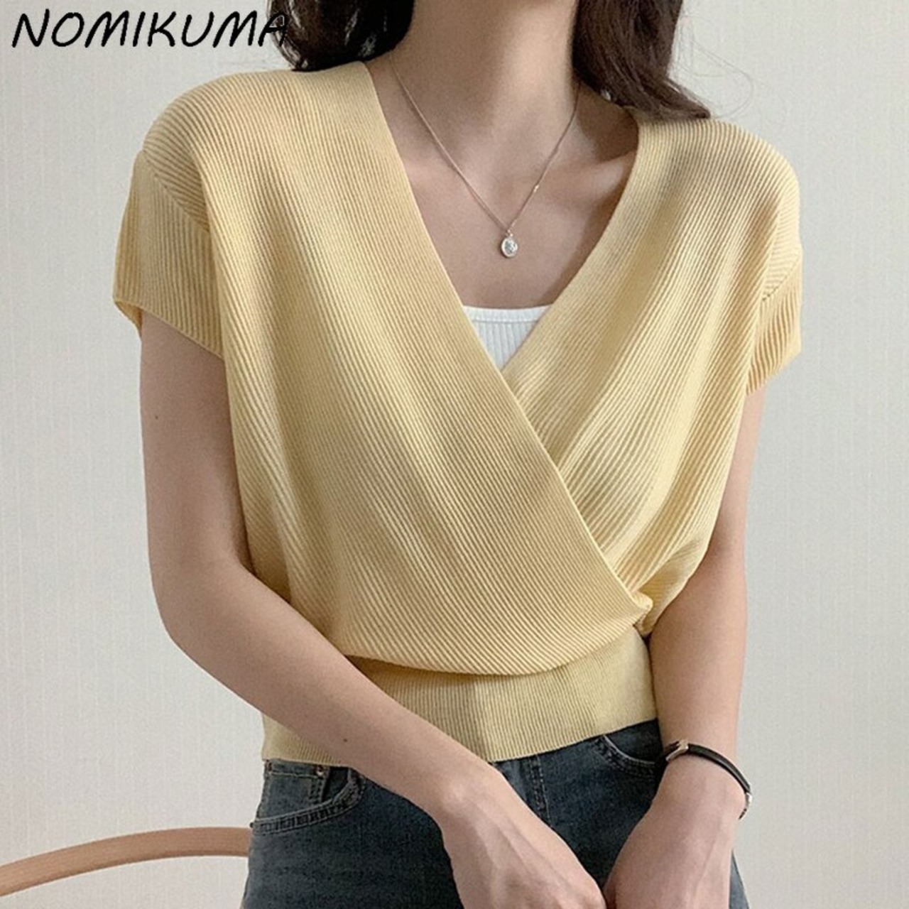 Nomikuma 夏ニットトップス女性アイスシルク半袖クロス V ネックニット 2022 無地プルオーバー ショート ハーフスリーブ サマー 夏物 Vネック ソリッドカラー kor93653035344