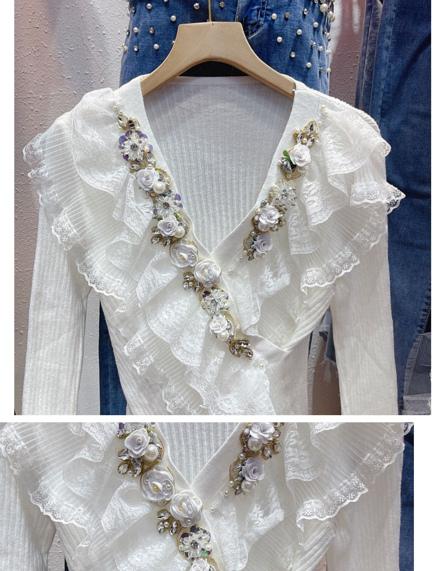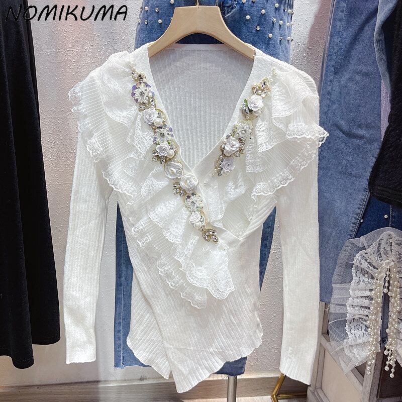 Nomikuma セーター女性秋冬プルオーバーニットシックなビーズ 3D 花 V ネック長袖スリムストレッチニットトップ ロング オータム 秋物 ウィンター 冬物 Vネック フラワーデザイン kor11089442320