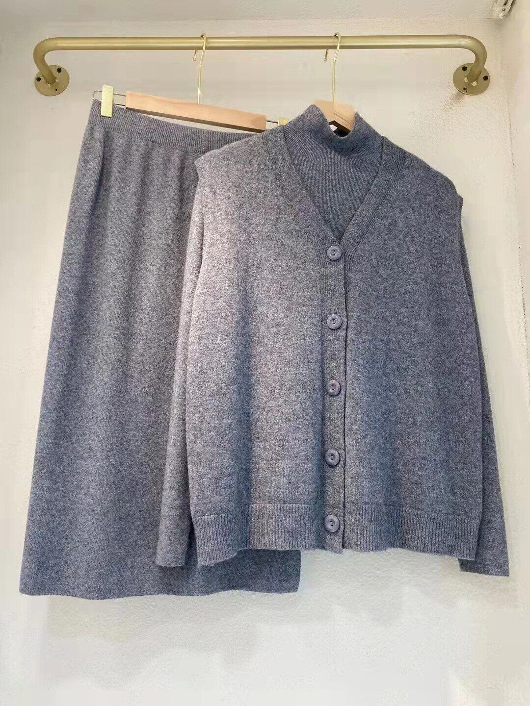 ノミクマ スリーピース セーター セット ノースリーブ ニット カーディガン ベスト + タートルネック ロング ルシーブ ニット + ウエスト分割スカート kor54693889411
