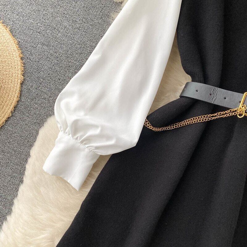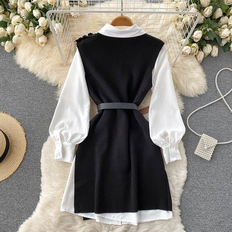 ノミクマ ツーピースワンピースセット 長袖ブラウスワンピース+ニットノースリーブベストベルト スリムウエストスーツ 6V908 ロング ドレス ハーネス kor4174187316