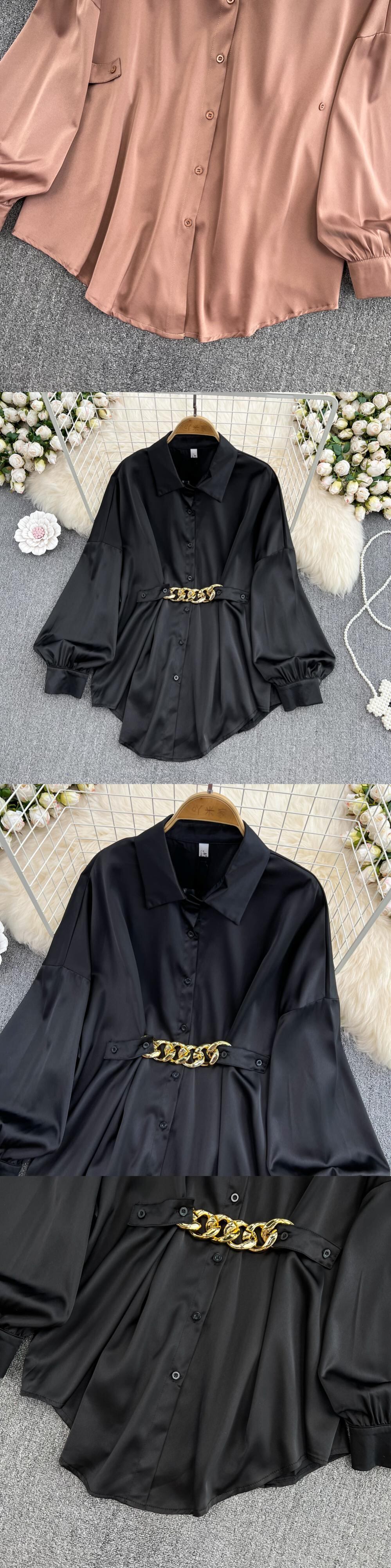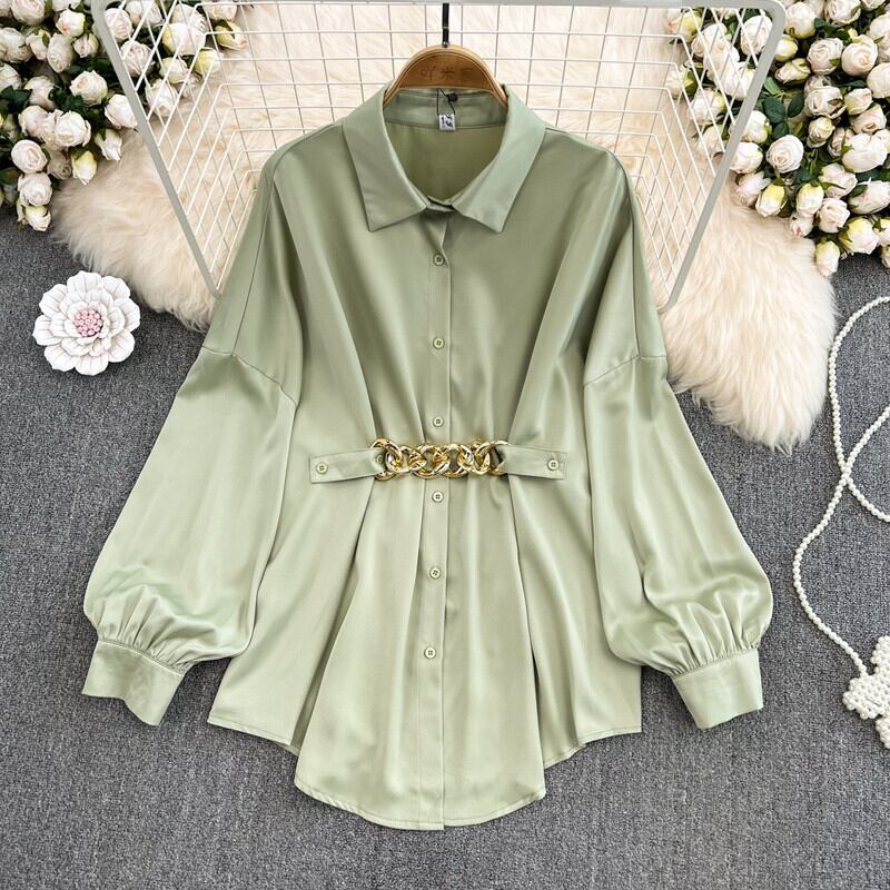 Nomikuma 2022 秋ランタンスリーブブラウス女性チェーンスリムウエストトップス因果無地シャツ オータム 秋物 ソリッドカラー kor67359736019