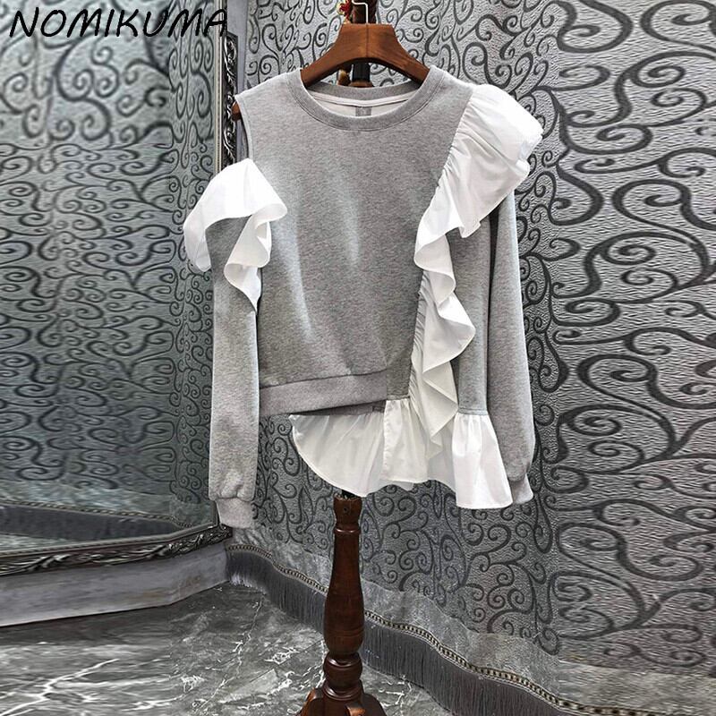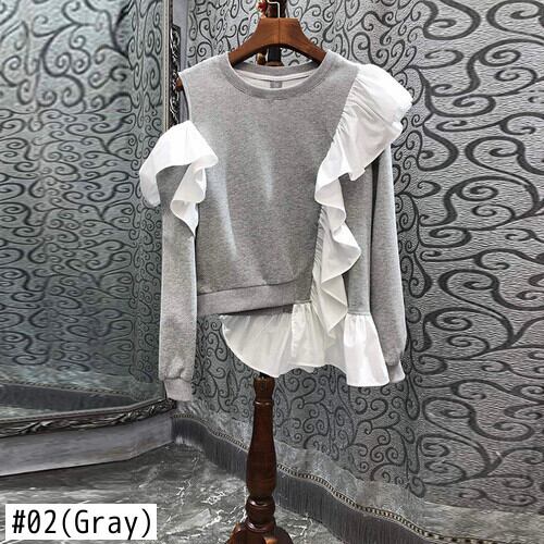 草引不規則なフリルパッチワーク女性スウェットシャツ因果ストラップレス長袖 O ネックジャンパー 2022 秋パーカートップ ロング オータム 秋物 Oネック kor62304362854