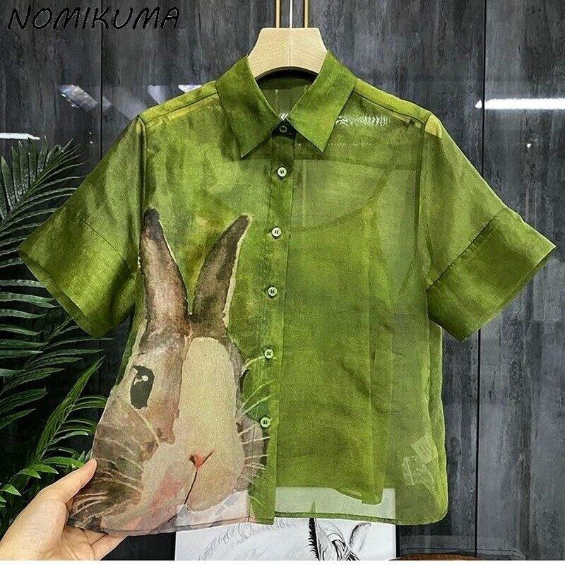 Nomikuma 2022 夏ガーゼショートブラウス漫画プリント女性シャツ甘いトップ + ベーシックスリングベストスーツ 大人ガーリー スウィート キュート カジュアル サマー 夏物 kor37758575135