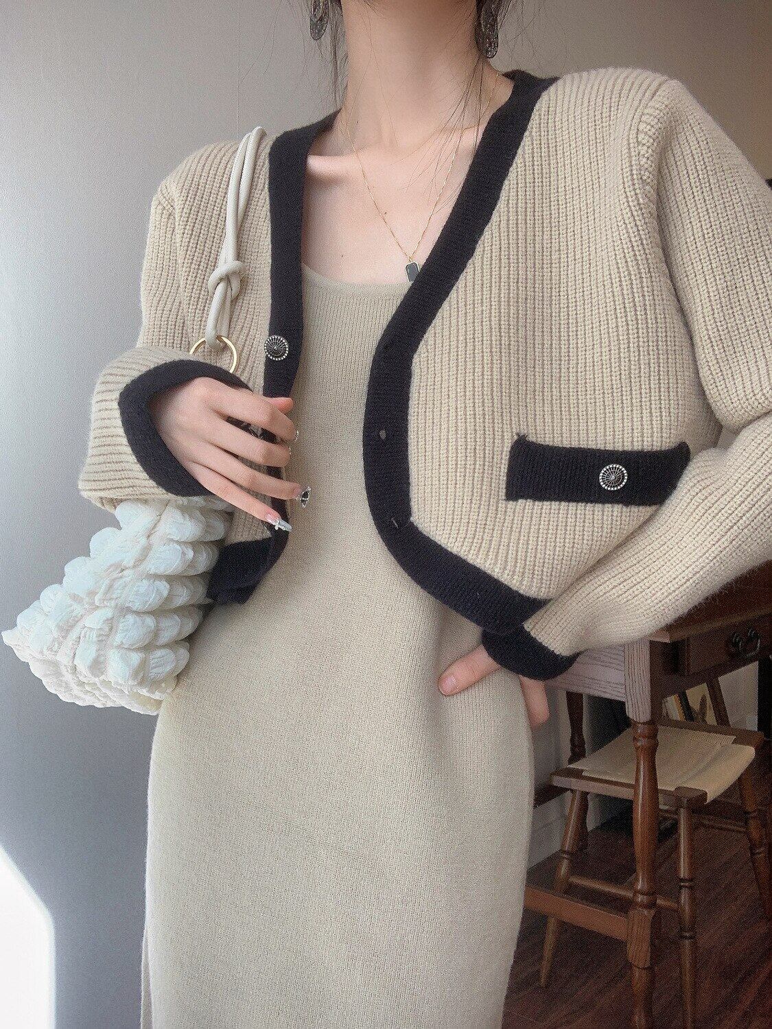 Nomikuma ニットドレスセット女性秋冬ヒットカラー V ネックセーターコート + ベーシックスリングスリムニットドレス 2 ピース オータム 秋物 ウィンター 冬物 Vネック kor76835655731