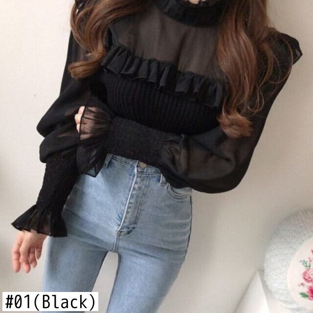 Nomikuma スタンドネックパッチワークフリルセーターフレアスリーブ女性ニットトップス秋フェイク二枚プルオーバー 6X126 オータム 秋物 kor10467957882