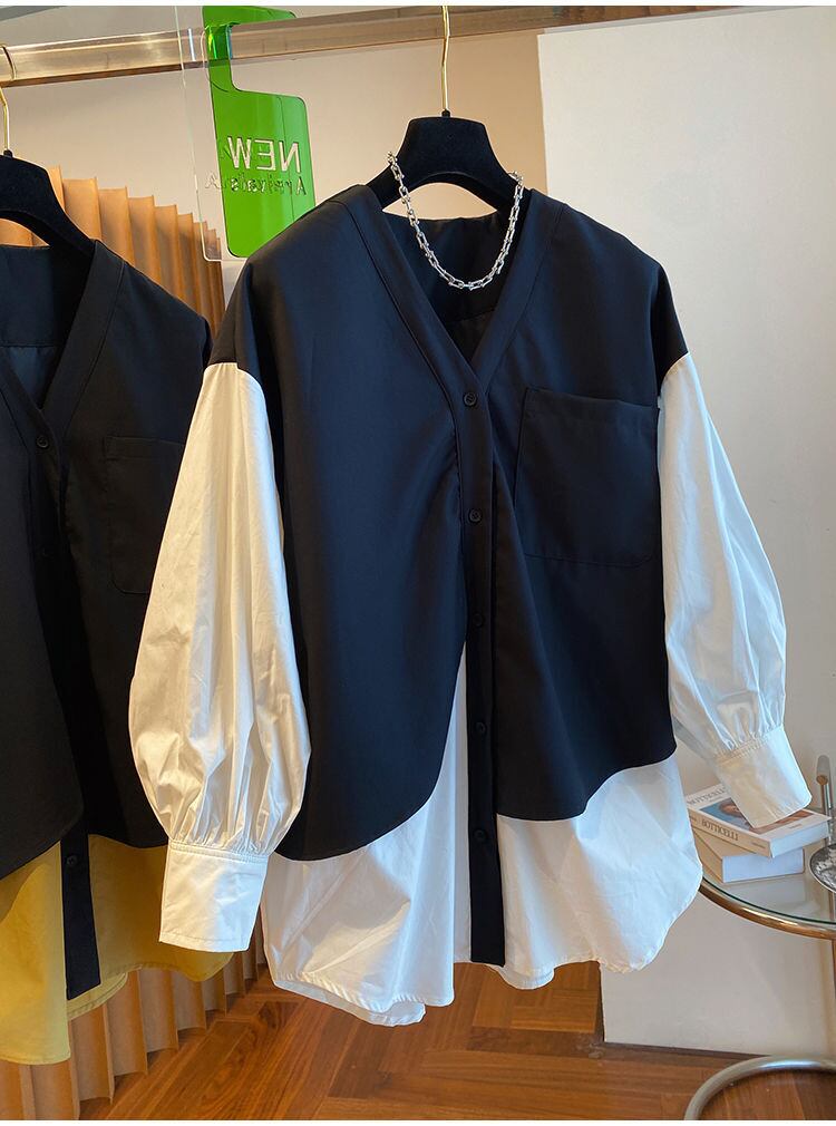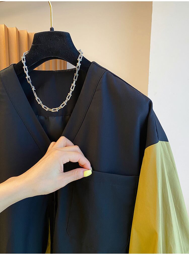 Nomikuma コントラストカラーパッチワークブラウス女性因果ランタン長袖 V ネックシャツ 2022 秋トップス ロング オータム 秋物 Vネック kor36588380552