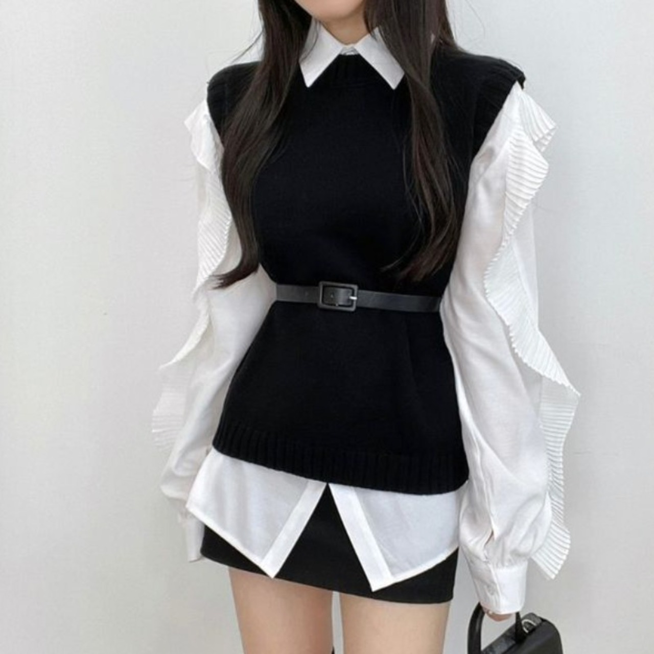 Nomikuma シックな秋の女性 2 ピース トップ セット シックなフリル ロング Lseeve ターンダウン カラー ブラウス + ベルト付きプルオーバー ベスト オータム 秋物 ハーネス kor32837619229