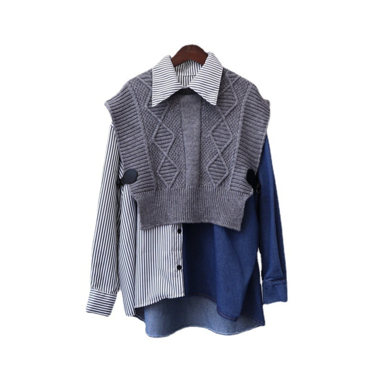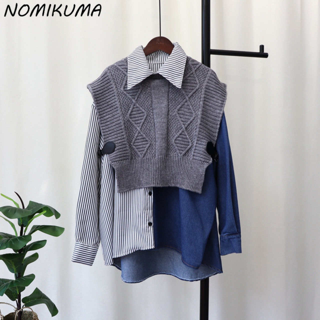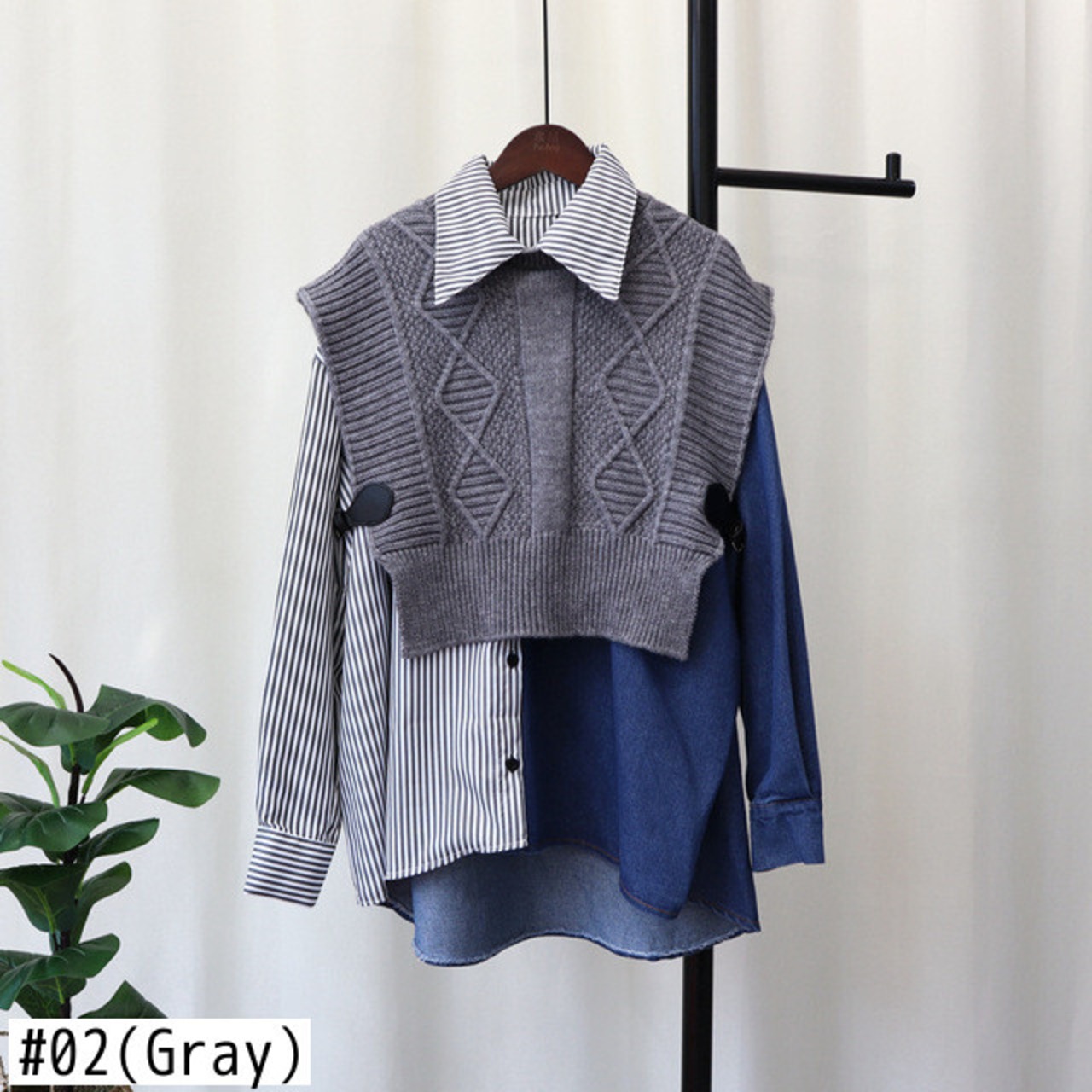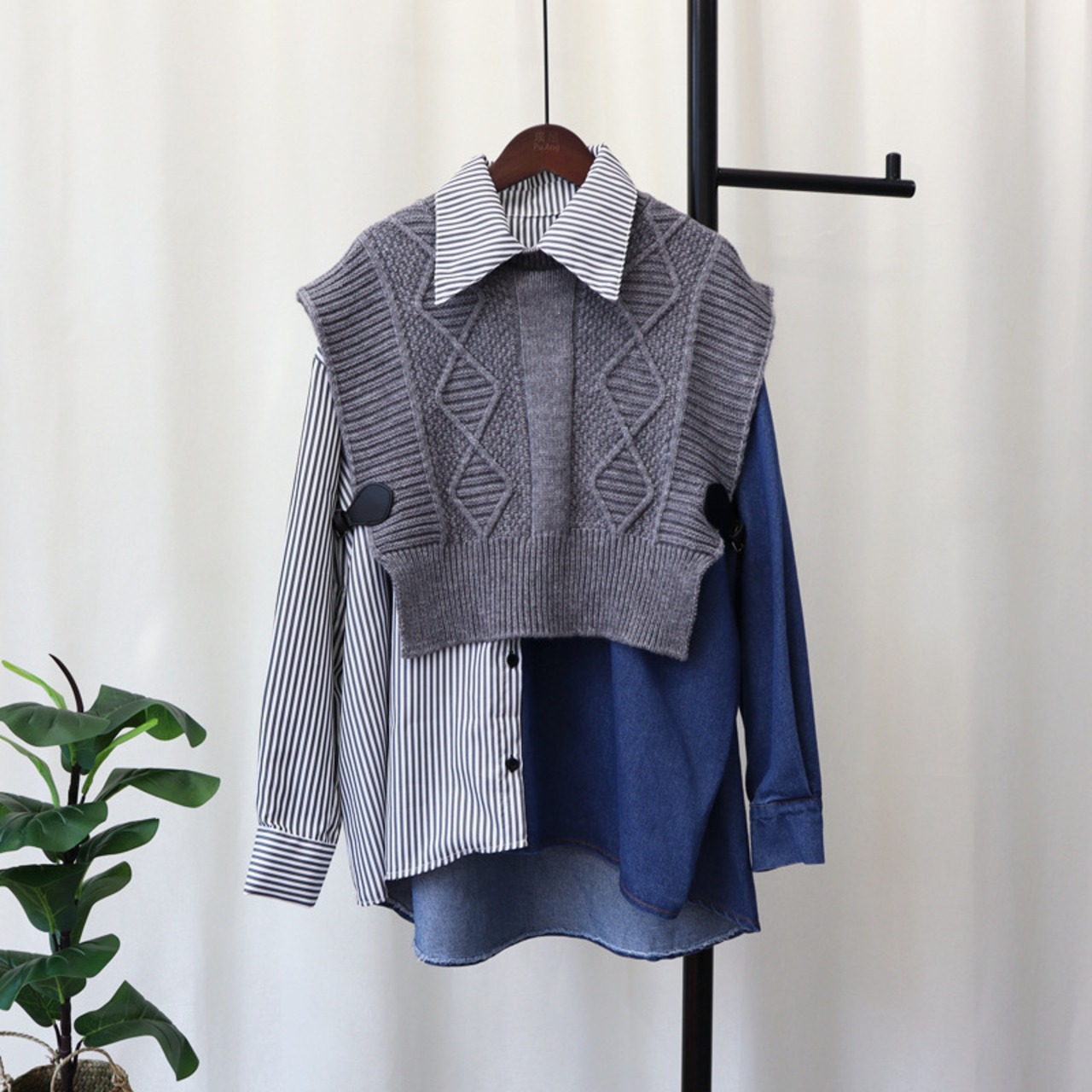 Nomikuma Demin パッチワーク ストライプ ブラウス + ニット ベスト 2 ピース 2022 秋冬セーター セット女性衣装 オータム 秋物 ウィンター 冬物 kor43717528680