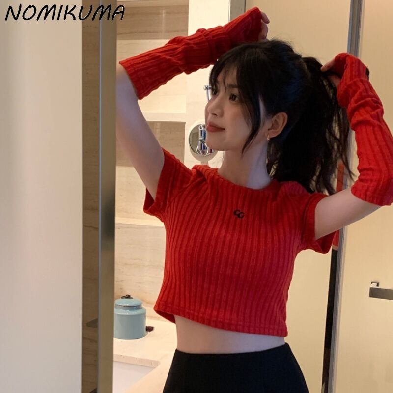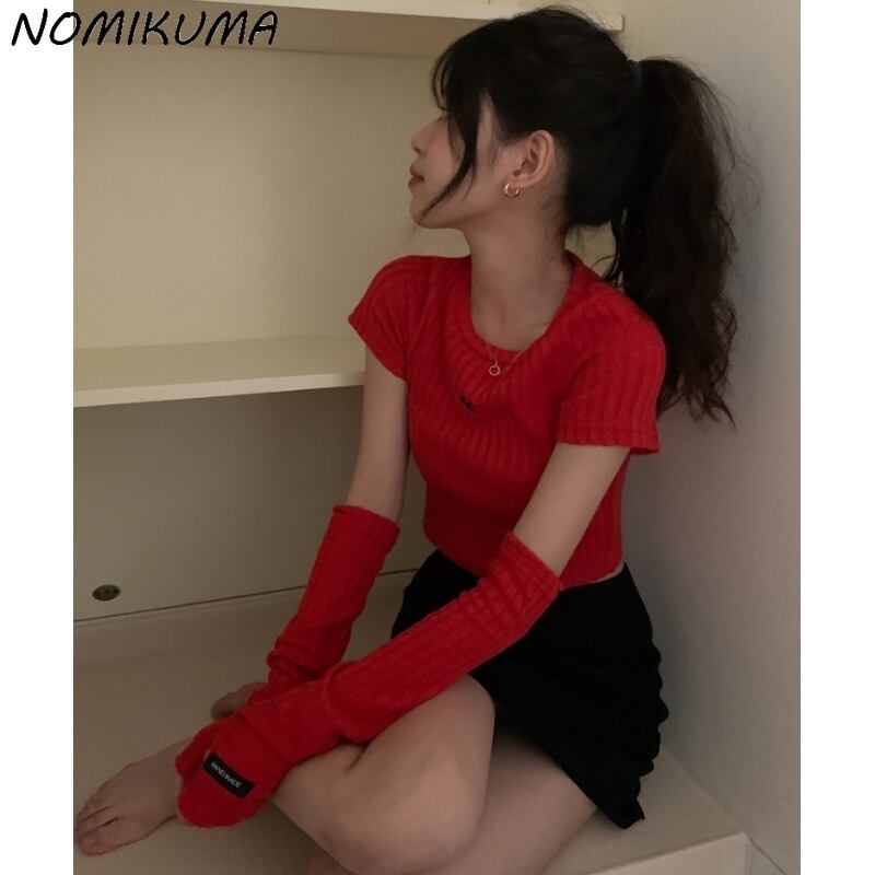 Nomikuma セクシーなスリムクロップニットトップス 2022 半袖 O ネックプルオーバーセータースタイルの女性ニット ショート ハーフスリーブ Oネック kor45127724986