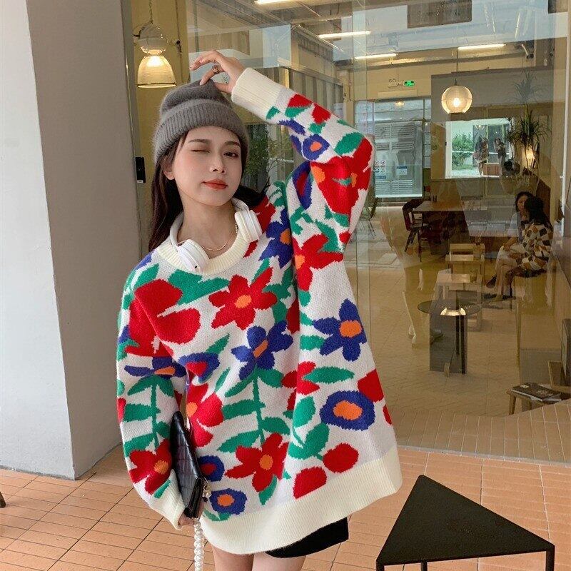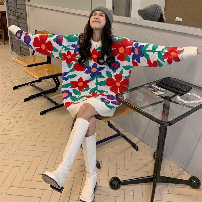 Nomikuma プル 2022 秋冬花女性セーター因果長袖 O ネックニットプルオーバートップス ロング オータム 秋物 ウィンター 冬物 Oネック フラワーデザイン kor1498702518