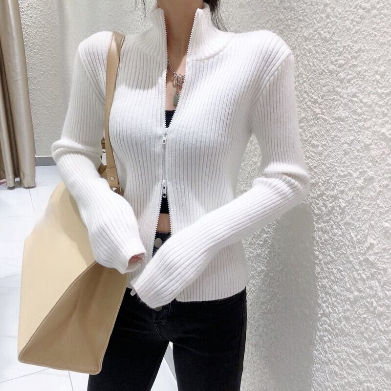 ノミクマ スタンドネック ダブルジッパー ニット カーディガン 2021秋 長袖 スリム ニット コート 無地 セーター 6L008 ロング オータム 秋物 ソリッドカラー kor69056097854