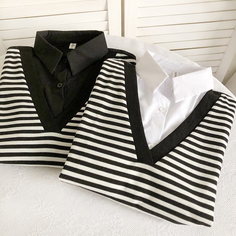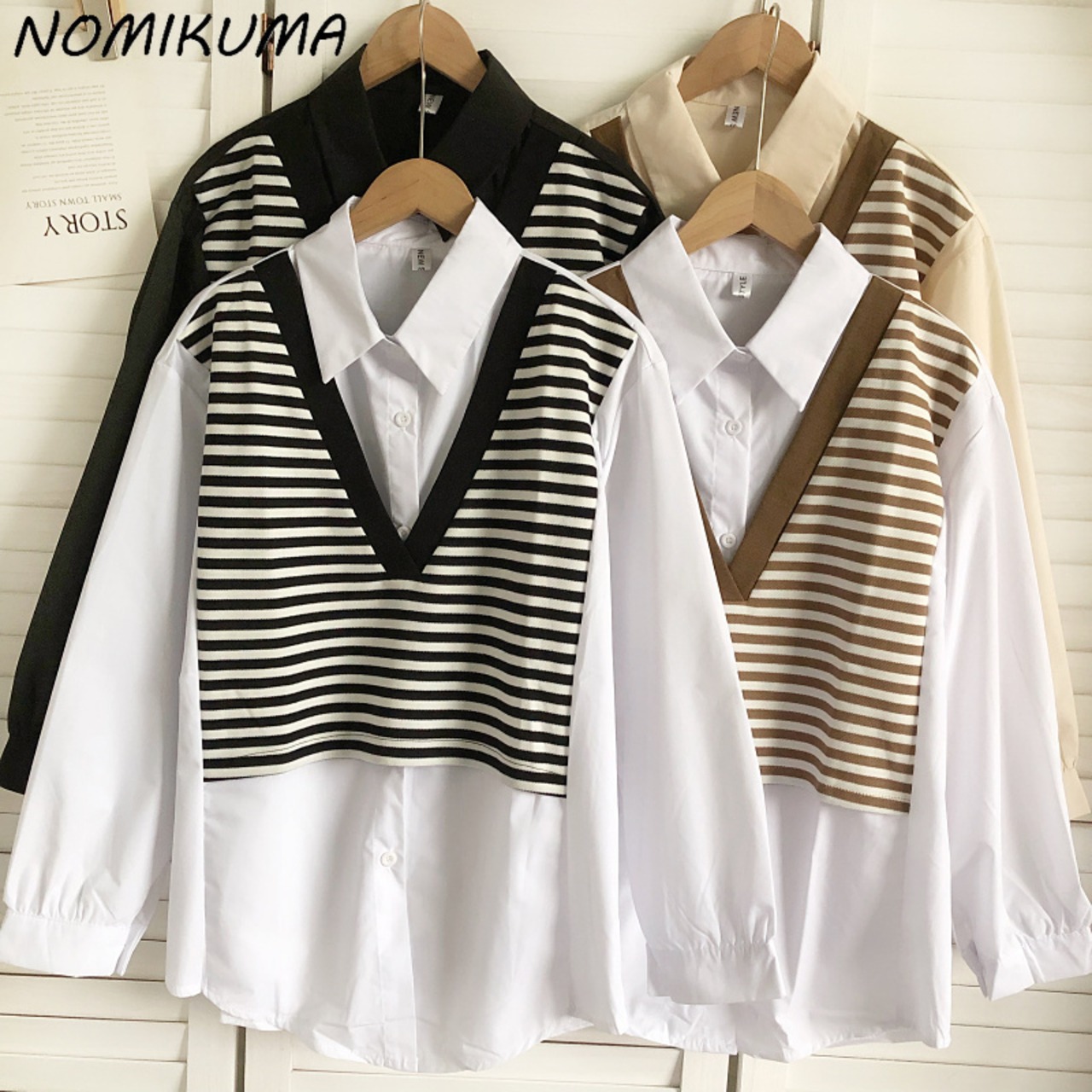 ノミクマ フェイクツーピース ブラウス 2022年 秋 カジュアル ストライプ パッチワーク シャツ カジュアル 長袖 トップス ロング オータム 秋物 kor82965425656