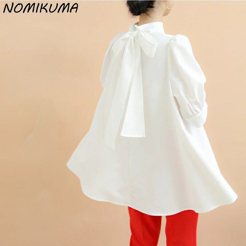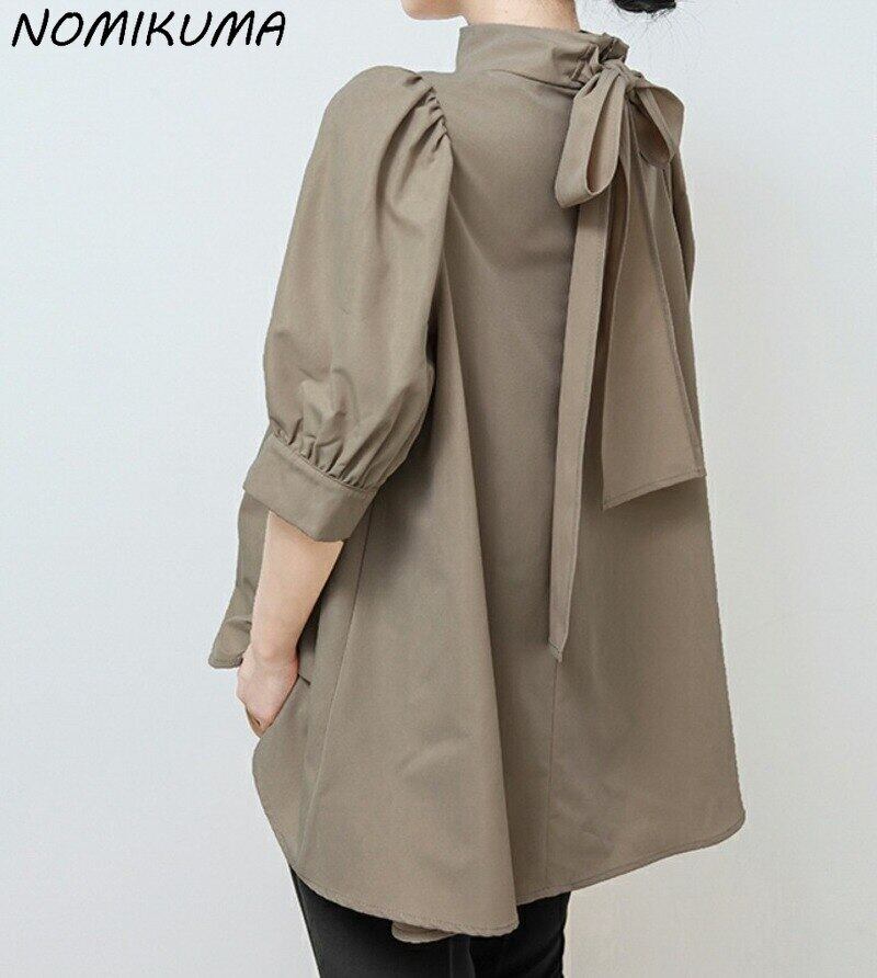 Nomikuma 甘い弓包帯スタンドネック女性人形シャツ因果パフスリーブプルオーバートップス 2022 春夏ルーススタイルブラウス リボン 大人ガーリー スウィート キュート カジュアル スプリング 春物 サマー 夏物 kor63829826068