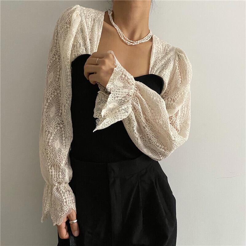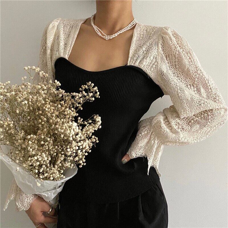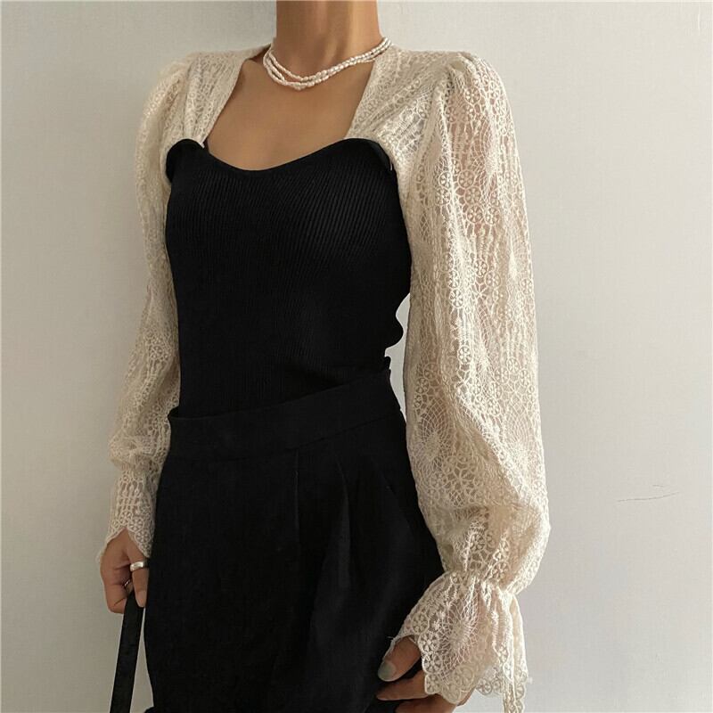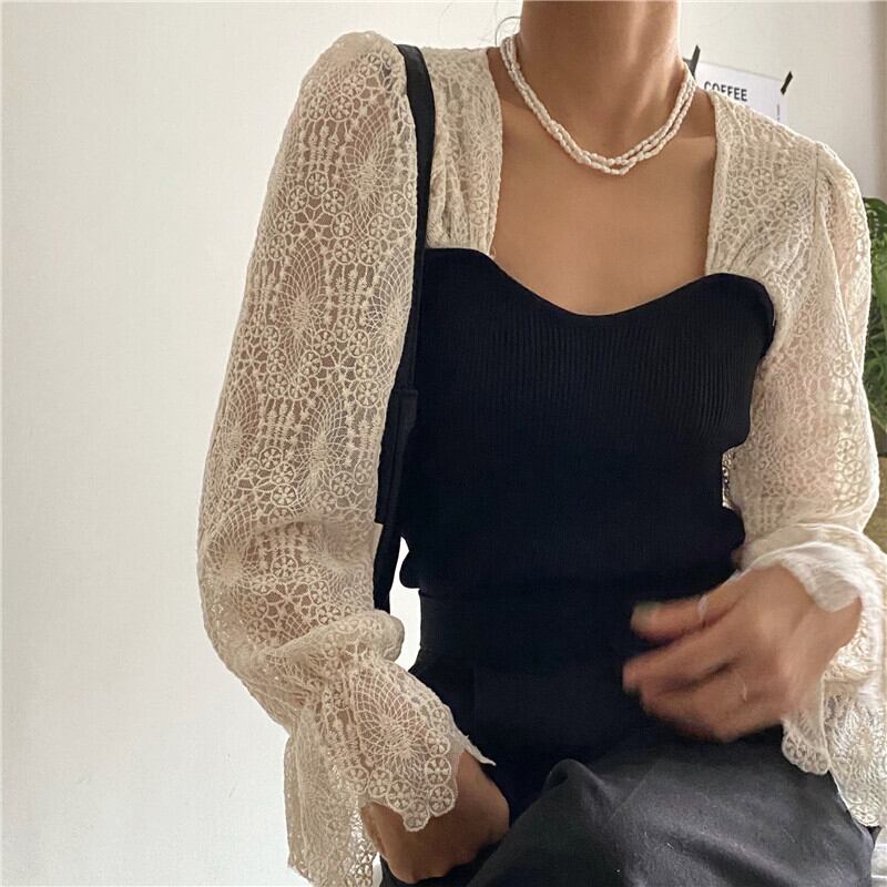 Nomikuma レース フレアスリーブ パッチワーク ニット トップス スクエアカラー レディース ニット 2021 秋 プルオーバー 6Z368 オータム 秋物 スクウェア kor33701039748
