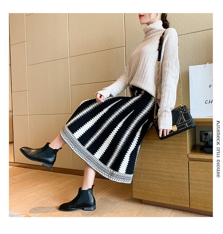 Nomikuma ブラック ホワイト ストライプ ニット スカート女性秋冬ボトムス 2000 ウエスト因果 A ライン セーター スカート オータム 秋物 ウィンター 冬物 Aライン kor59705299690