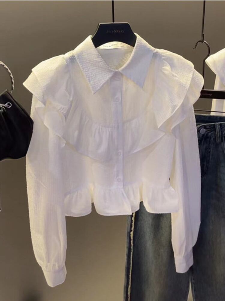 Nomikuma シックなフリルパッチワーク女性シャツ 2022 秋長袖ターンダウン襟ブラウススウィートトップス ロング 大人ガーリー キュート カジュアル オータム 秋物 kor33177267033