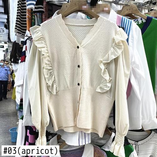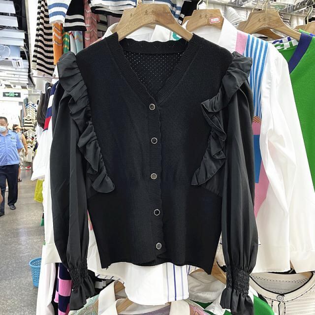 Nomikuma シックなフリルパフスリーブパッチワーク女性カーディガンニット 2022 秋のヒットカラーストライプ V ネックセーターコート オータム 秋物 Vネック kor94924995495
