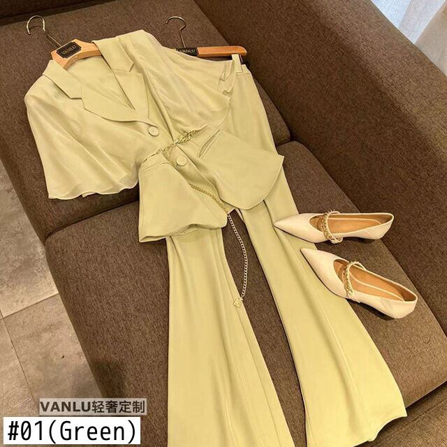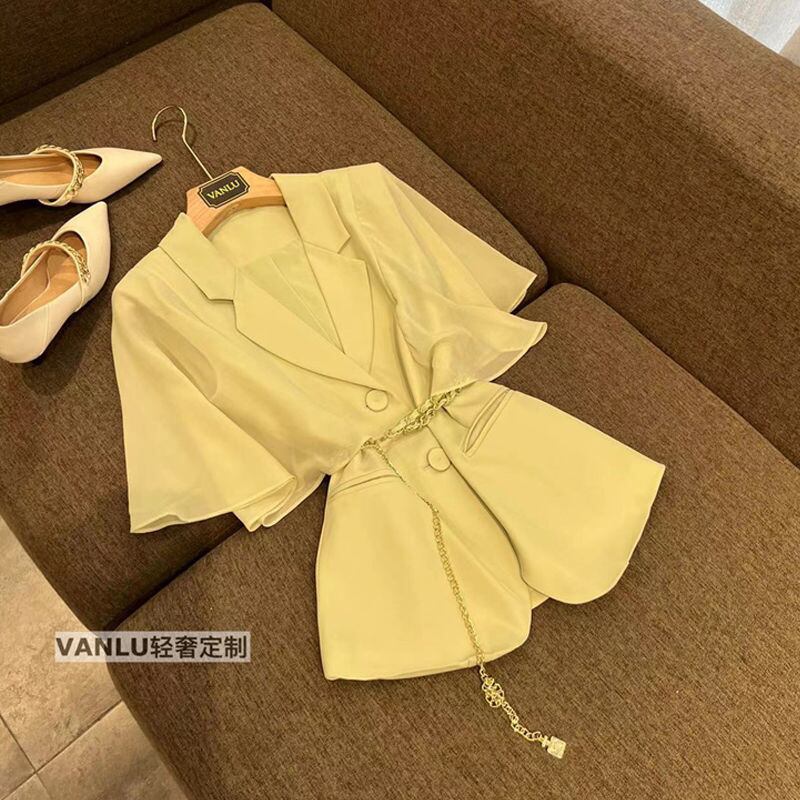Nomikuma Fahion レディース セット 2022 半袖 ベルト スリム ウエスト ノッチ カラー ブレザー + ウエスト フレア ロング パンツ ショート ハーフスリーブ ハーネス kor43346048884