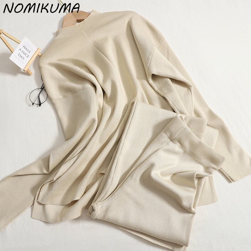 Nomikuma 秋冬ニットツーピースレディースセット長袖プルオーバースプリット Swetaer トップス + ウエストワイドレッグロングパンツ オータム 秋物 ウィンター 冬物 ワイドパンツ kor6467645457