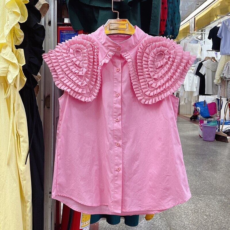 ノミクマシックな立体花ピーターパン襟ブラウストップス女性ノースリーブ 2022 夏シャツ因果無地 サマー 夏物 ソリッドカラー フラワーデザイン kor9965533753