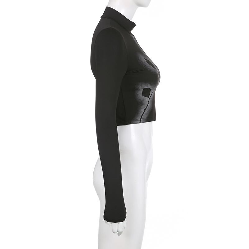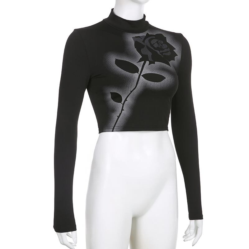 Nomikuma ローズフラワープリントタートルネック長袖ベーシック Tシャツ女性 2022 秋冬セクシーなスリムショートグラフィック Tシャツ ロング オータム 秋物 ウィンター 冬物 フラワーデザイン kor16459772093