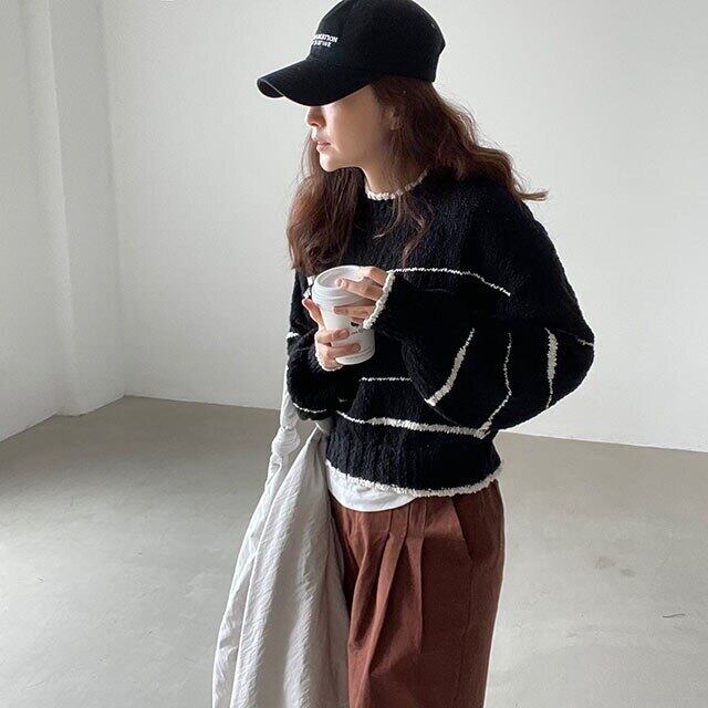 ノミクマ 因果 Oネック ヒットカラー ストライプ プルオーバー セーター 2022秋冬 プルニット トップス ジャンパー オータム 秋物 ウィンター 冬物 kor67358434538