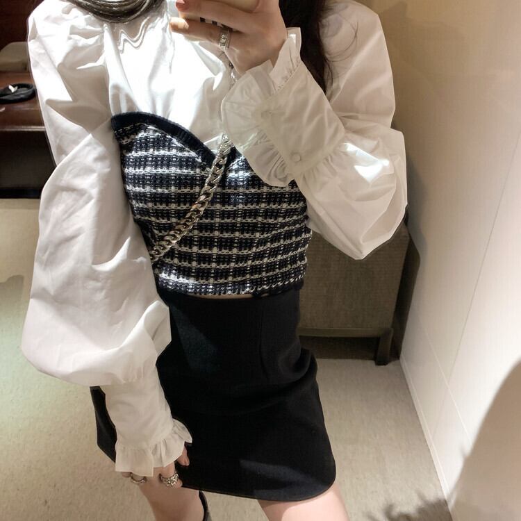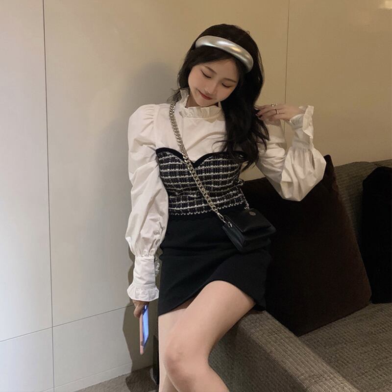 Nomikuma フリルスタンドネック女性ブラウスパフ長袖シャツ 2021 パッチワークフェイク二枚 Blusa トップ 6D778 ロング kor55557601153