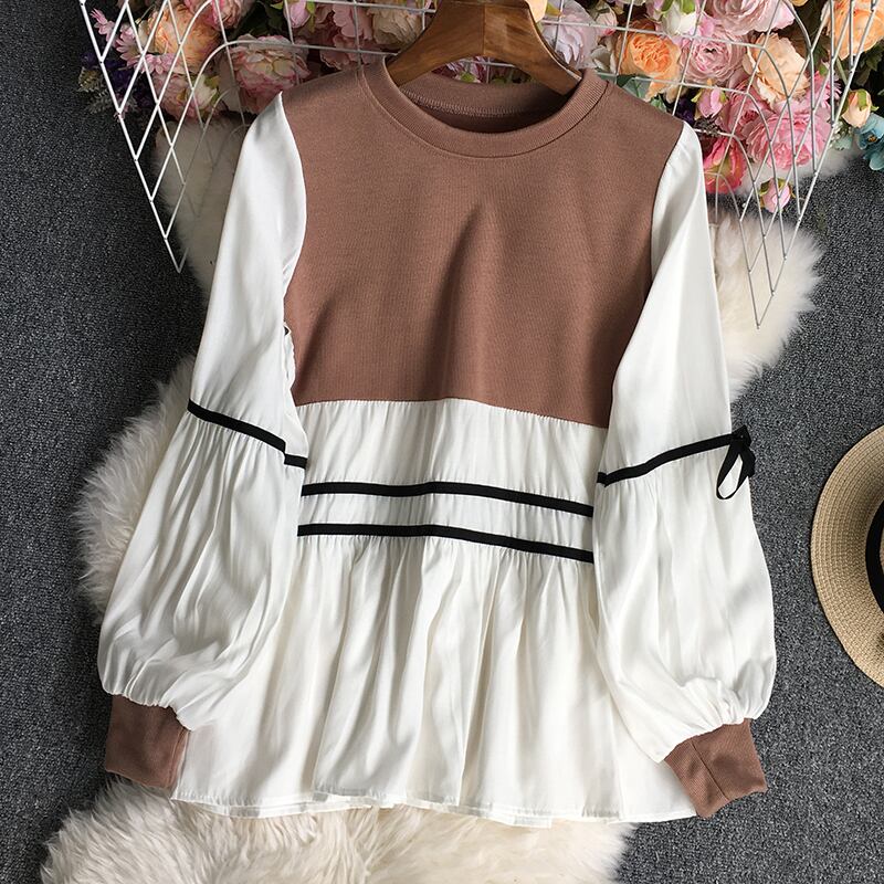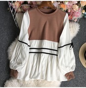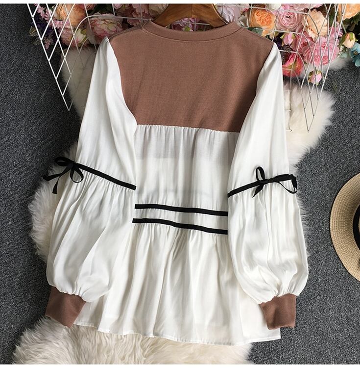Nomikuma ニットヒットカラーパッチワーク女性ブラウス蝶ネクタイパフ長袖 O ネックシャツ 2022 秋甘いトップ ロング リボン 大人ガーリー スウィート キュート カジュアル オータム 秋物 Oネック kor62189120722