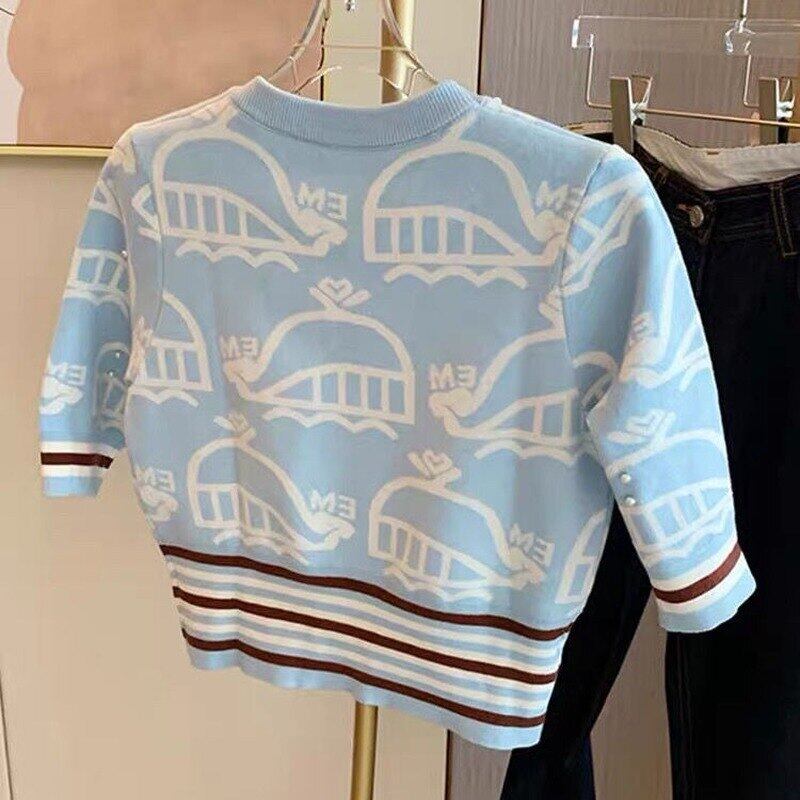 Nomikuma シックな印刷パフスリーブセーター女性 2022 春夏ニットトップビーズ O ネックヒットカラーストライププルオーバーニット スプリング 春物 サマー 夏物 Oネック kor29470966426