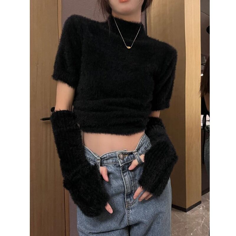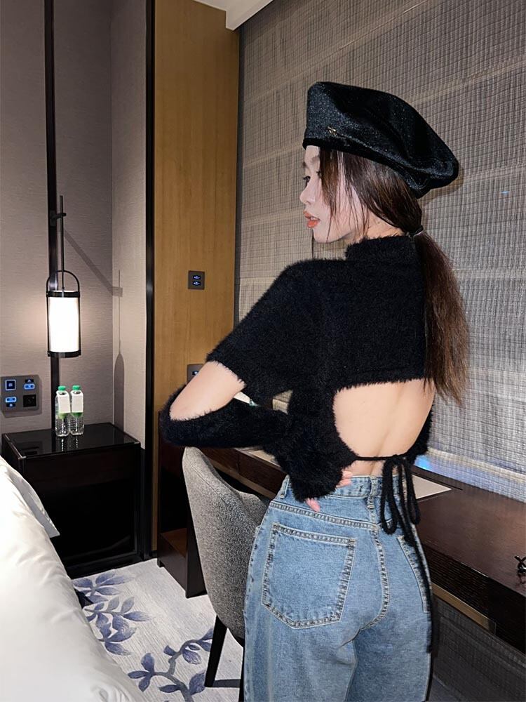 ノミクマ 2022年春 スタンドカラー ニット 裏レース くり抜きセーター カジュアル セクシー ショート ニット トップス スプリング 春物 kor4132503185