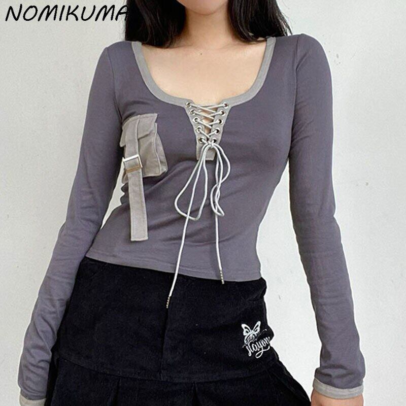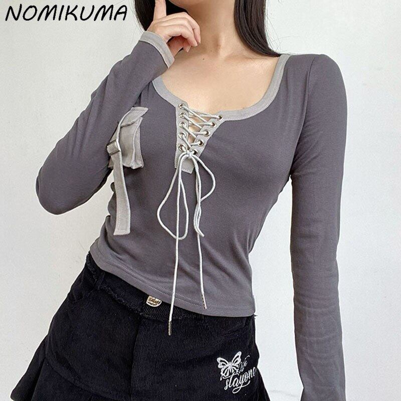 Nomikuma ヒットカラーレースアップ O ネックセクシーなスリムショート女性 Tシャツ長袖 2022 秋ポケットパッチワークグラフィック Tシャツ ロング オータム 秋物 Oネック kor4348799296