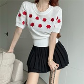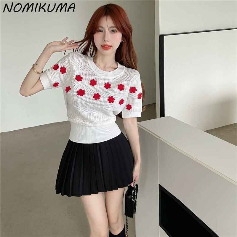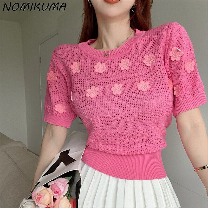 Nomikuma アイスシルク中空アウトフックニットスリムウエスト女性ニットトップス 2022 夏半袖 O ネックセーター ショート ハーフスリーブ サマー 夏物 Oネック kor45008619953