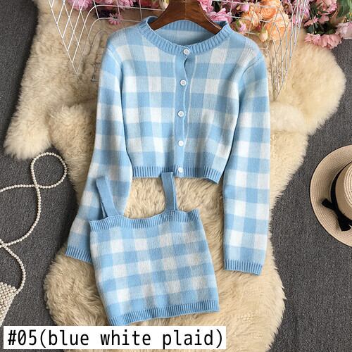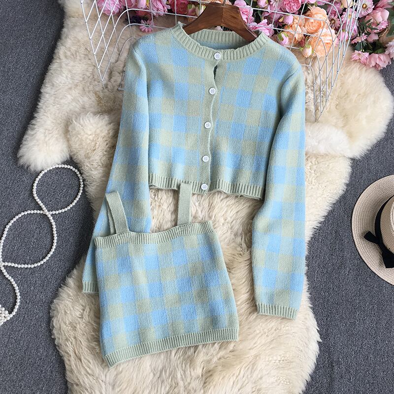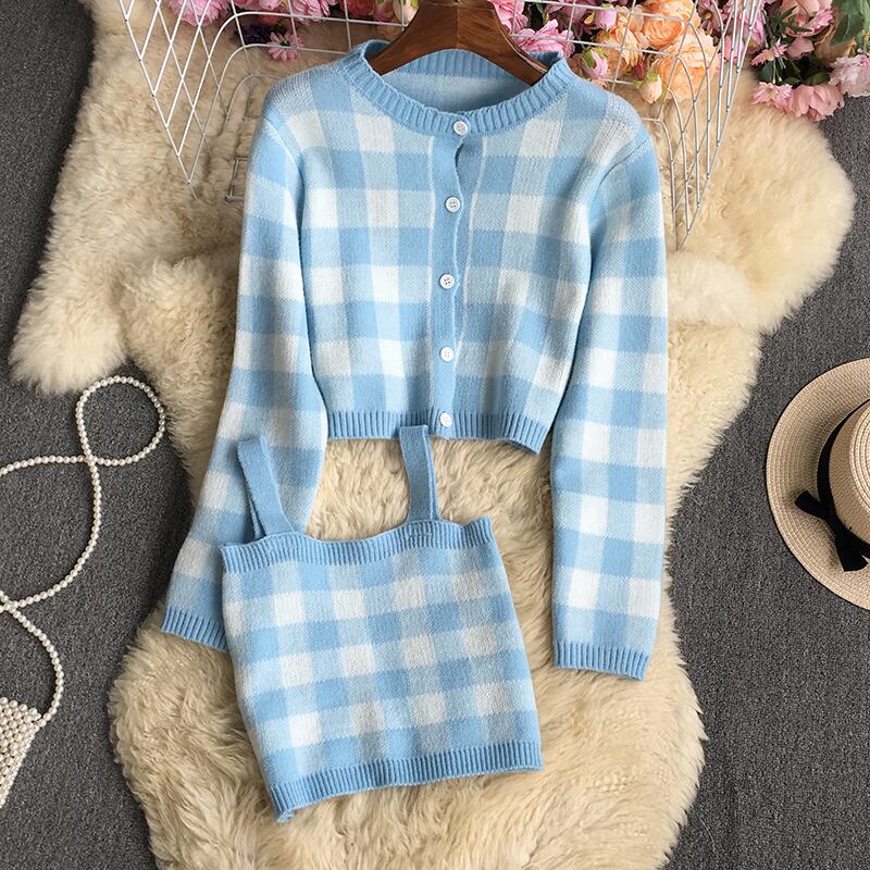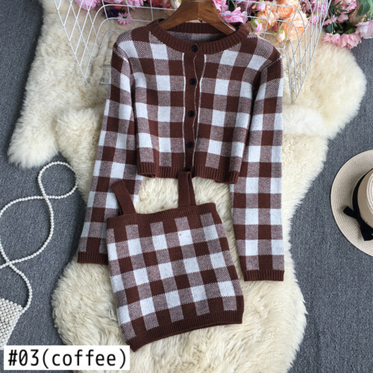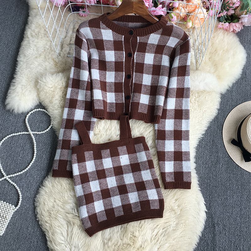 Nomikuma 二枚ニットチェック柄セット長袖 O ネックセーターコート + ベーシックスリングベスト 2022 秋の女性ニットトップス ロング オータム 秋物 Oネック kor2736707458