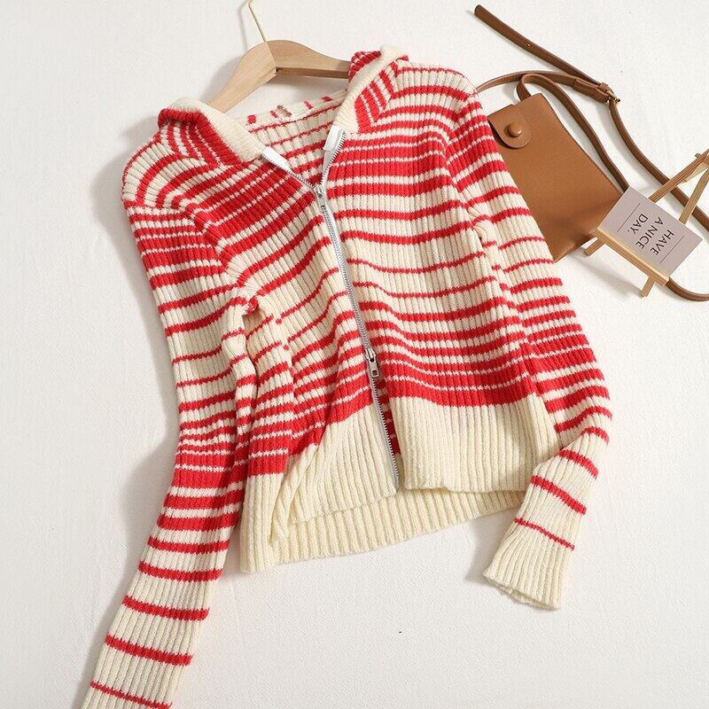 Nomikuma ヒットカラーストライプジッパーフード付きニットカーディガン女性 2022 秋のセーターコート因果長袖ニット ロング オータム 秋物 kor96566655212