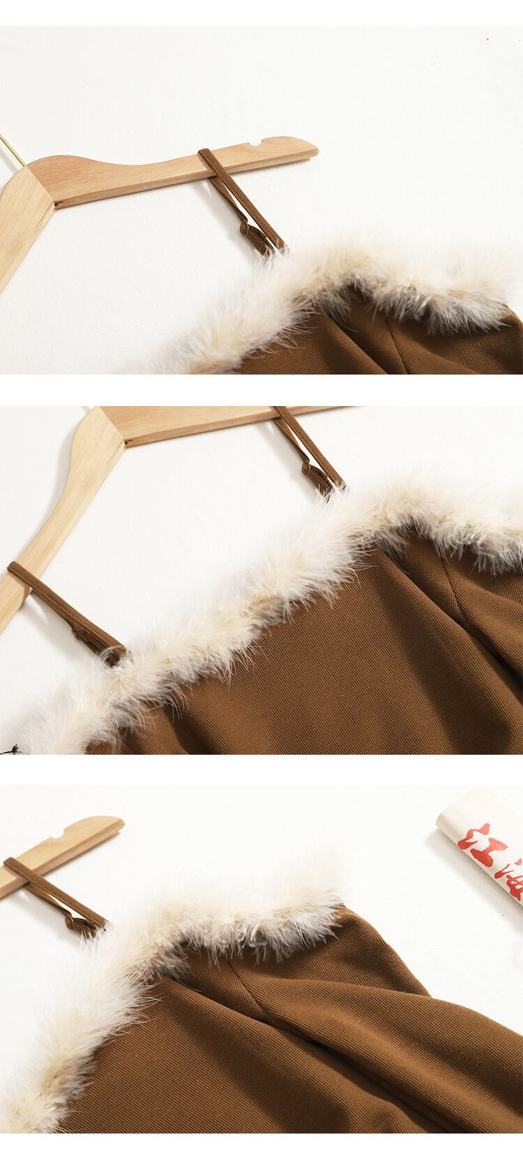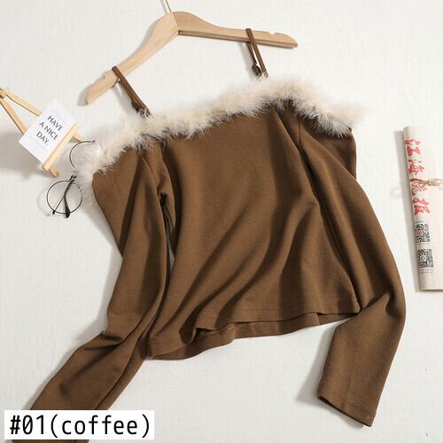 Nomikuma 毛皮パッチワークスラッシュネックスリングシャツ女性長袖セクシーなストラップレスグラフィック Tシャツ 2022 秋トップス ロング オータム 秋物 kor88501022202