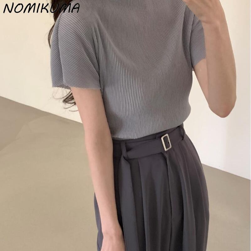 ノミクマシックなスタンドネックフォールドニット半袖トップスレディースサマー2022プルオーバー ショート ハーフスリーブ 夏物 kor34143314379
