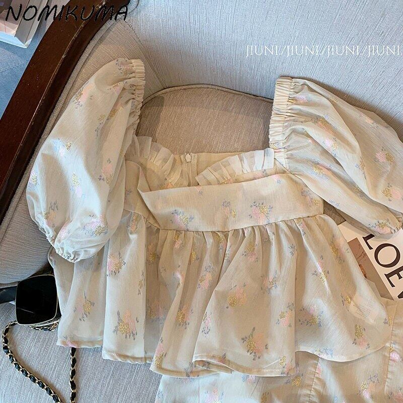 Nomikuma ツーピースセット女性スカート甘い夏 2022 衣装スクエア Colalr パフスリーブショートトップとミニスカートセット 大人ガーリー スウィート キュート カジュアル サマー 夏物 スクウェア kor36312886446