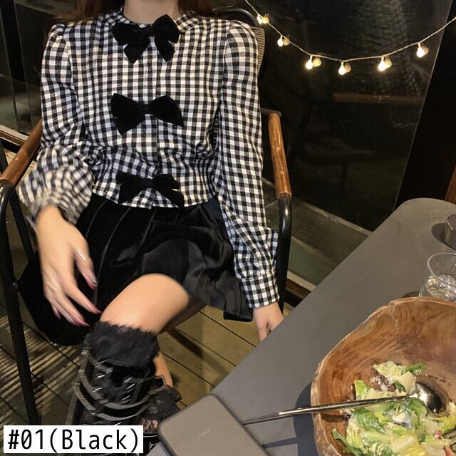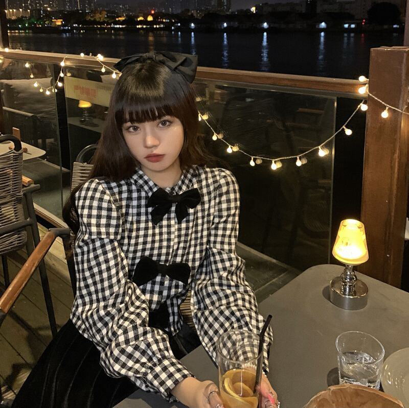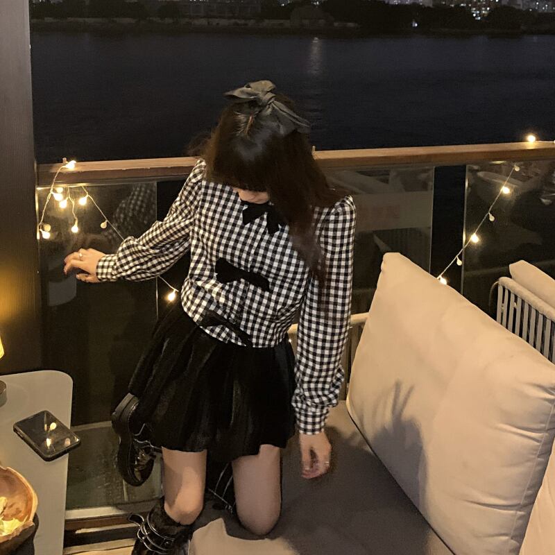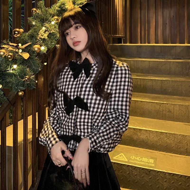 Nomikuma Sweet Bowknot Plaid Blouse Shirt Spring 2022 Women Tops Chic Puff Sleeve De Moda Verano リボン ブラウス 大人ガーリー スウィート キュート カジュアル スプリング 春物 kor93565974521