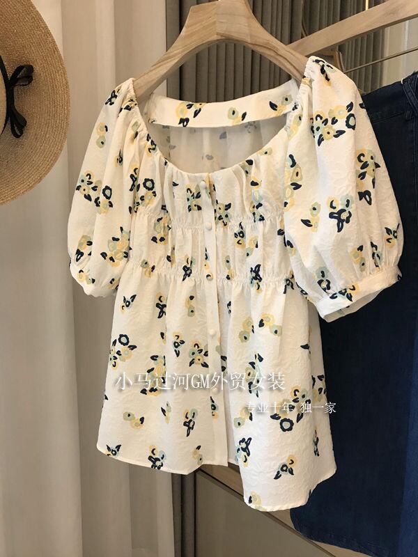 Nomikuma シックな 2022 夏花女性シャツパフスリーブスクエアカラーブラウストップス因果シングルブレスト Feminima サマー 夏物 花柄 スクウェア kor88202286734