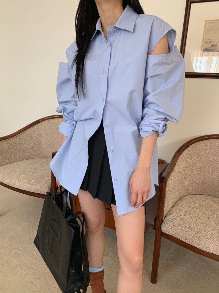 ノミクマ 折り衿くり抜き 長袖 ブラウス シャツ 2022秋 無地 カジュアル カミサ ロング オータム 秋物 ソリッドカラー kor47096856078