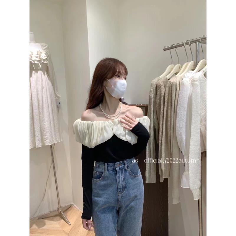Nomikuma オフショルダートップス女性ヒットカラーフリルパッチワークシャツ 2022 秋長袖スリムセクシーなストラップレス Tシャツ ロング オータム 秋物 kor20366477766