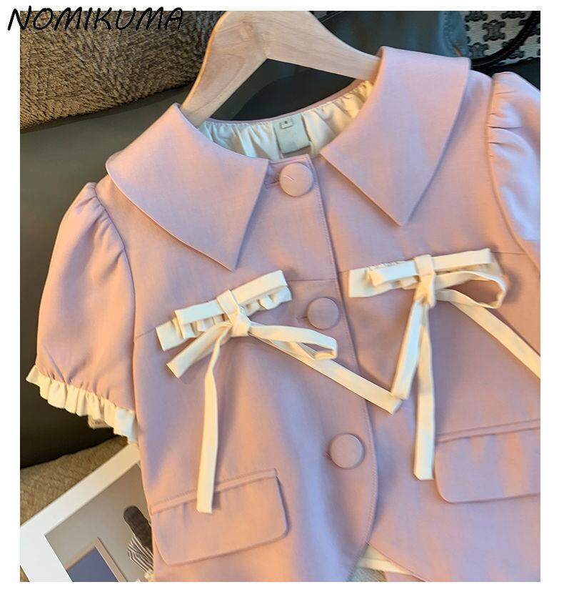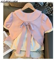 Nomikuma スウィートパフスリーブピーターパン襟トップス女性ちょう結びショートブラウス夏ミニスカートマッチングセットシック リボン 大人ガーリー キュート カジュアル サマー 夏物 kor89669484059