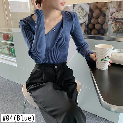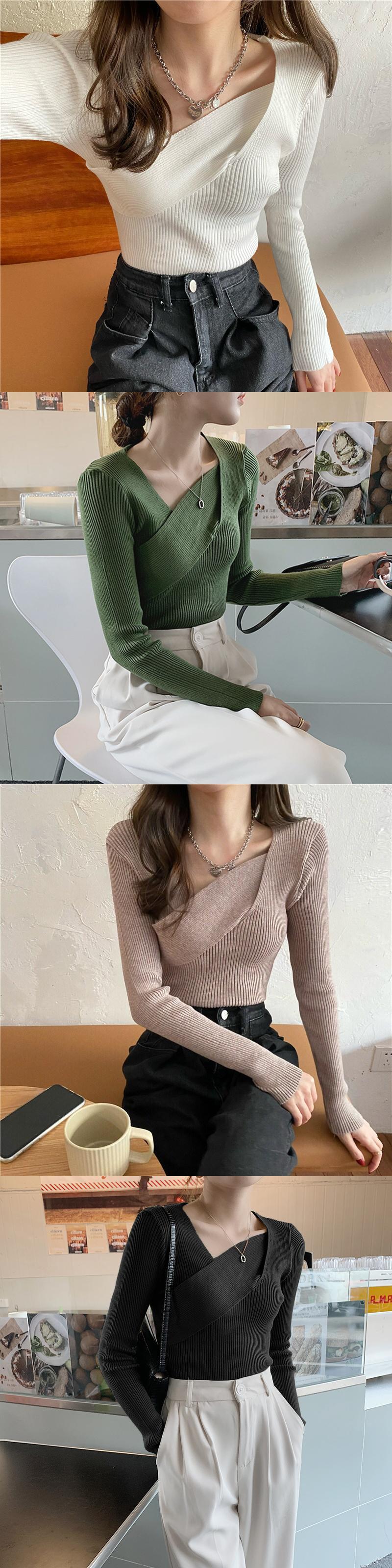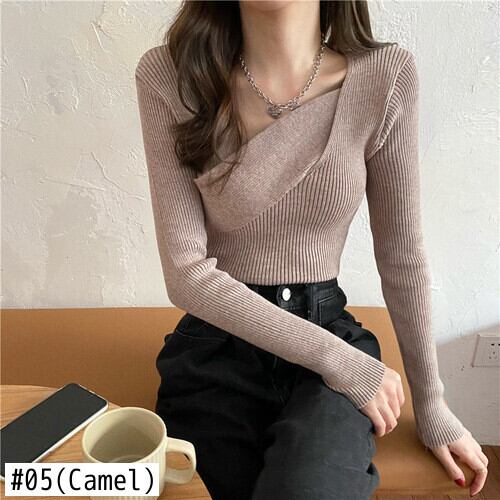 Nomikuma クロス V ネック不規則なニット女性秋冬ベーシックセーター長袖無地スリムストレッチニットトップス ロング オータム 秋物 ウィンター 冬物 Vネック ソリッドカラー kor32124504955