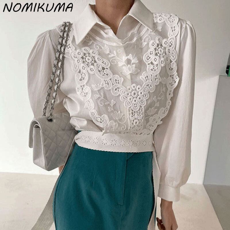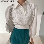 Nomikuma 二枚セット女性ターンダウン Colalr 因果長袖ブラウス + 包帯レースフックベスト 2022 秋のスーツ ロング オータム 秋物 kor27152218818